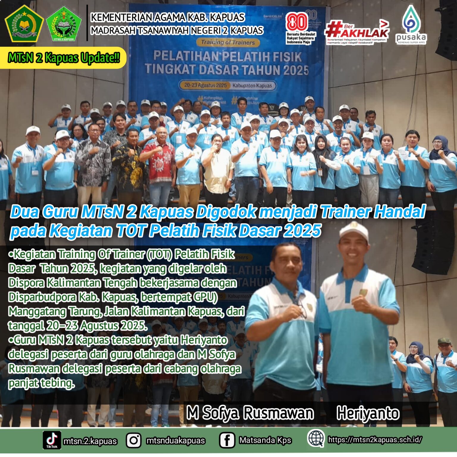 Pelatihan yang berlangsung dari tanggal 20–23 Agustus 2025 ini, diikuti 40 peserta dari unsur pengurus cabang olahraga, guru olahraga, serta pelaku olahraga di Kabupaten Kapuas, Dua diantaranya guru MTsN 2 Kapuas yaitu Heriyanto delegasi peserta dari guru olahraga dan M Sofya Rusmawan delegasi peserta dari cabang olahraga panjat tebing.