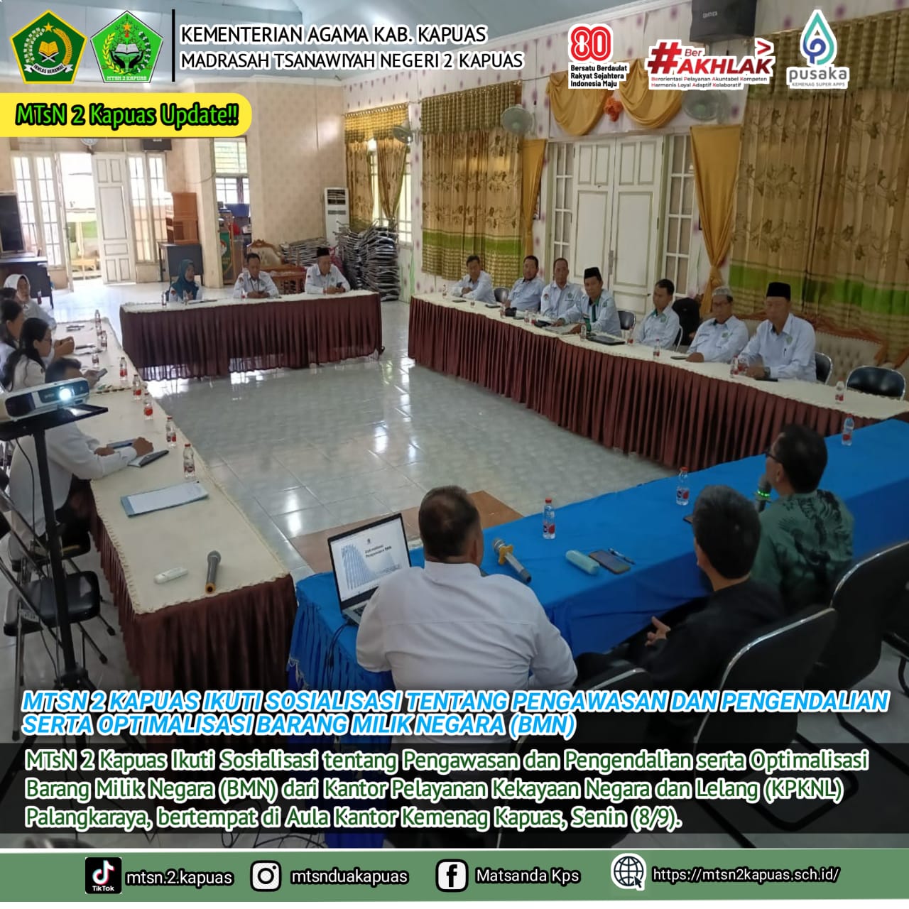 Kapuas (Humas) Madrasah Tsanawiyah Negeri (MTsN) 2 Kapuas turut berpartisipasi dalam kegiatan Sosialisasi Pengawasan, Pengendalian, serta Optimalisasi Barang Milik Negara (BMN) yang diselenggarakan oleh Kantor Pelayanan Kekayaan Negara dan Lelang (KPKNL) PalangkaRaya bertempat di Aula Kantor Kementerian Agama Kabupaten Kapuas. Senin (08/09).
